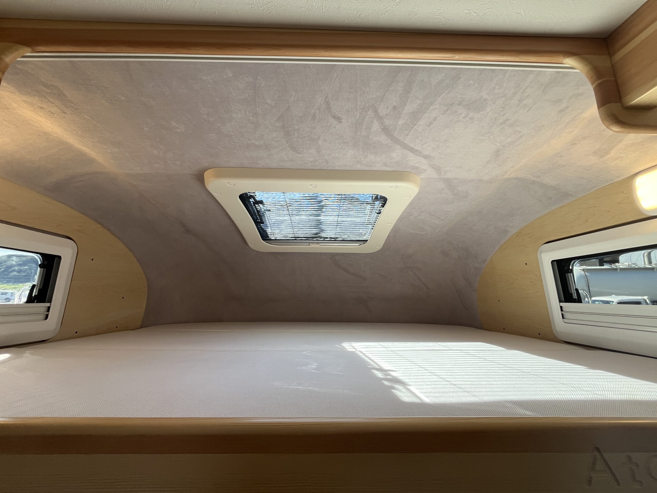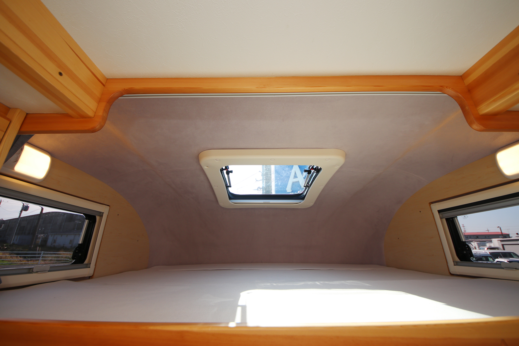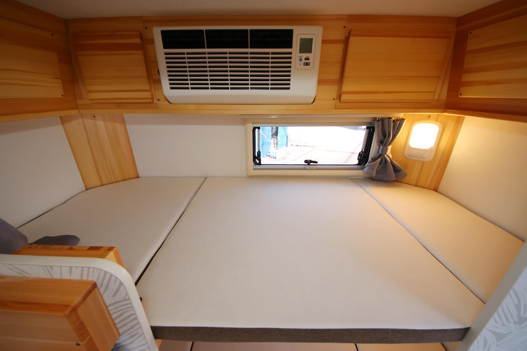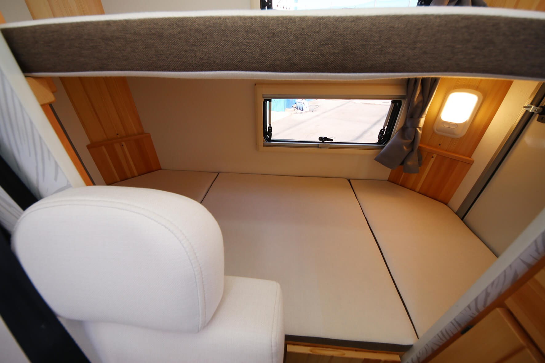 バンク部はL1500mm×W1800mmのバンクベッドとなっています。大人も子供も嬉しいサンルーフ付き!
