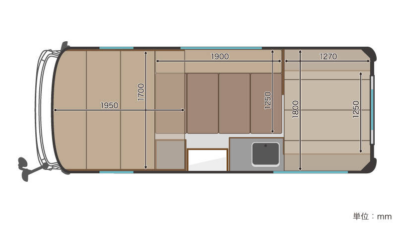 ダイネットを展開するとベッドスペースL1900×W1230mmになります