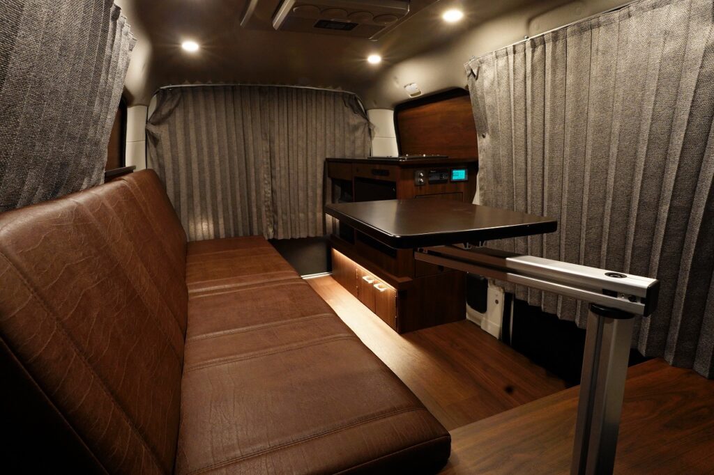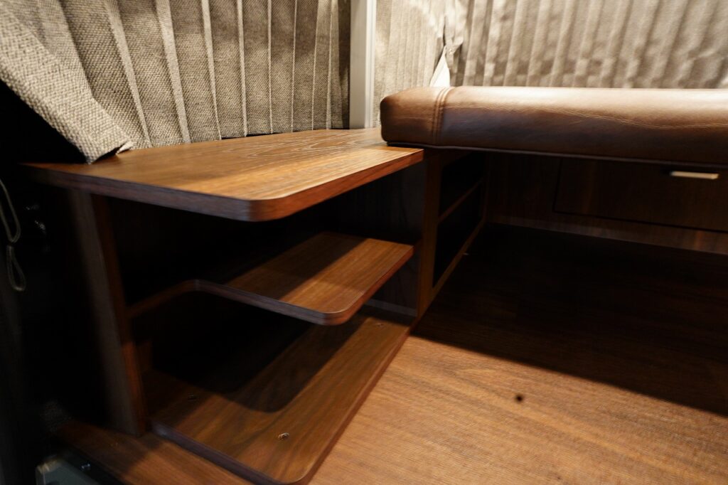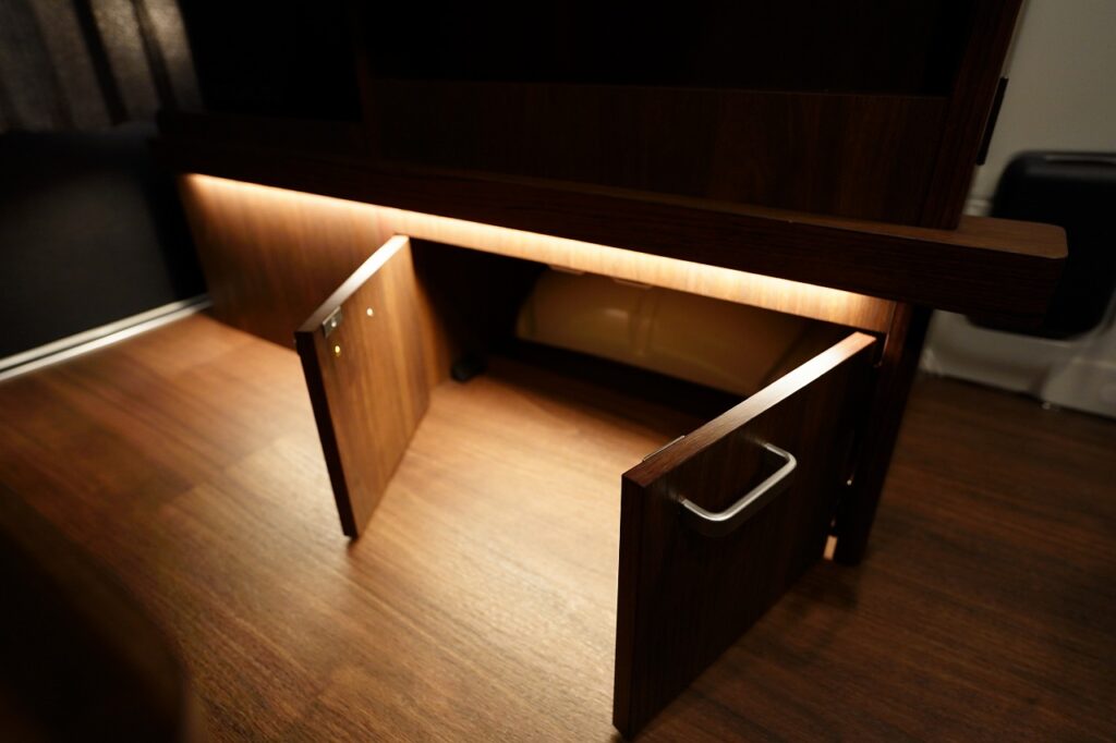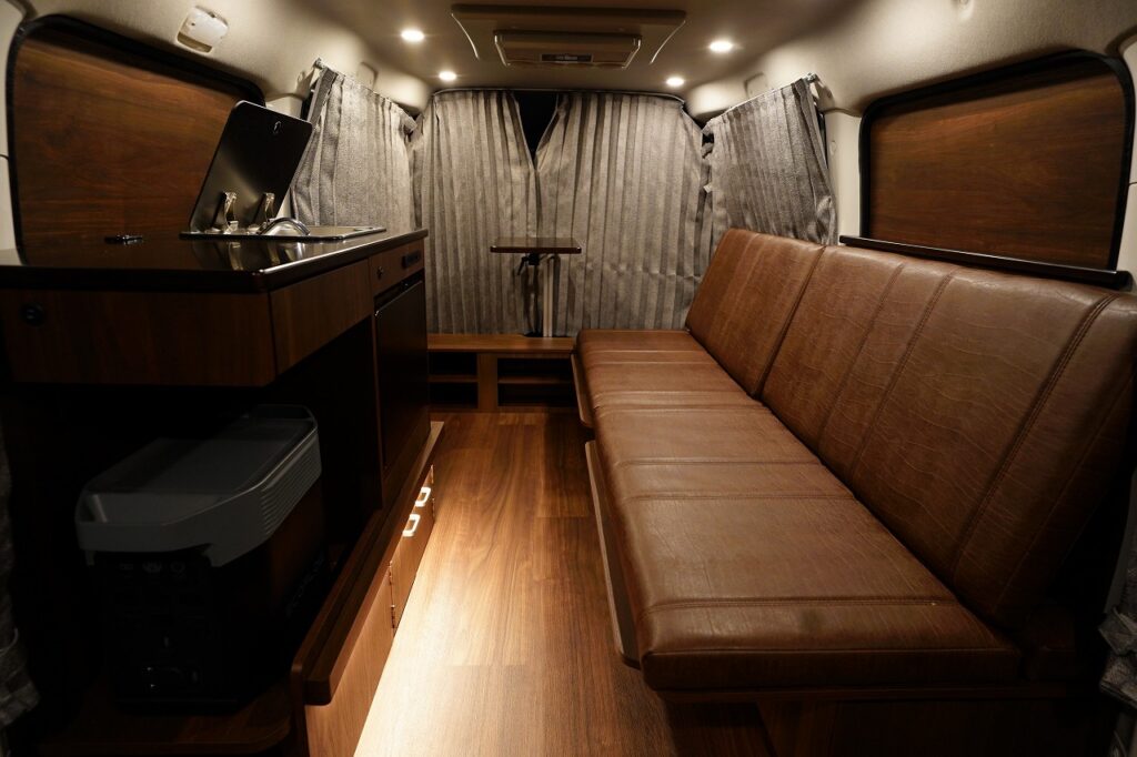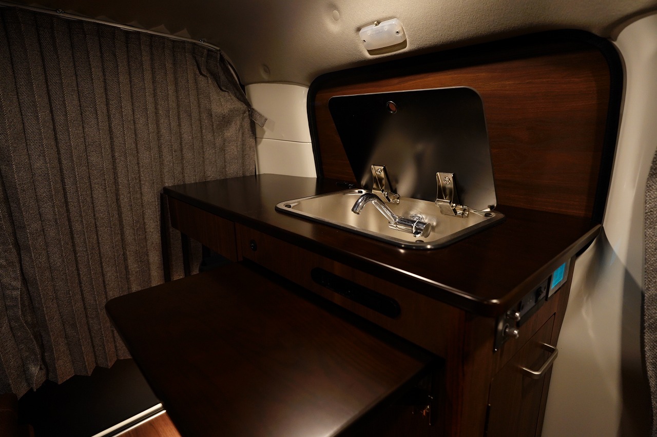 シンクや10L給排水タンク、跳ね上げ式テーブルを装備し、高級感あふれる家具で上質な空間を演出します。