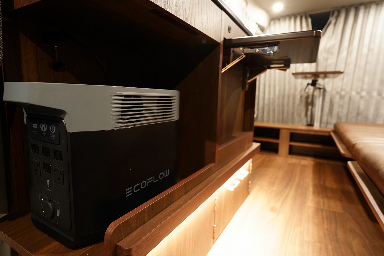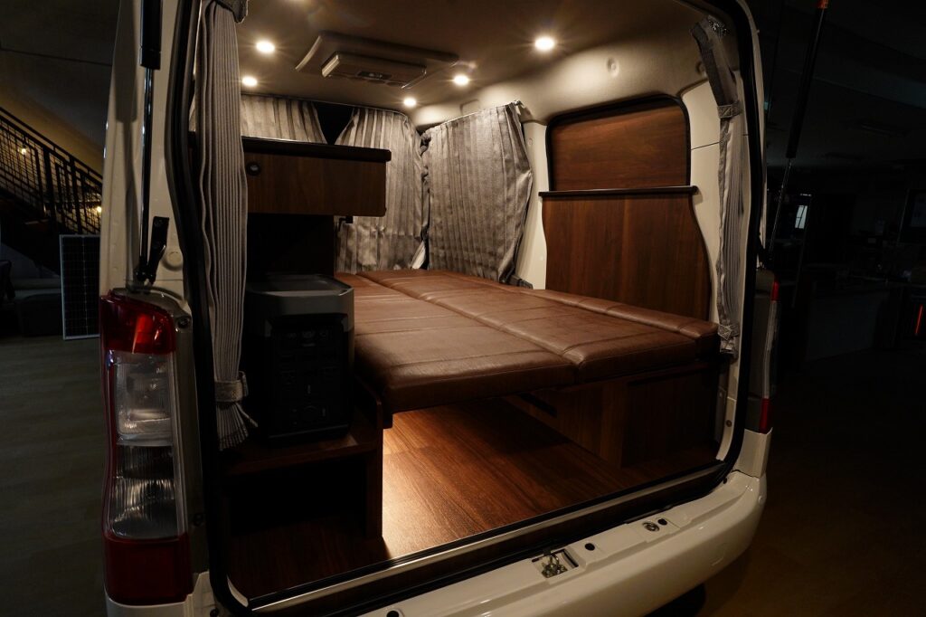 サブバッテリー100Ahと1000Wインバーターに加え、走行充電・外部充電設備を標準装備。