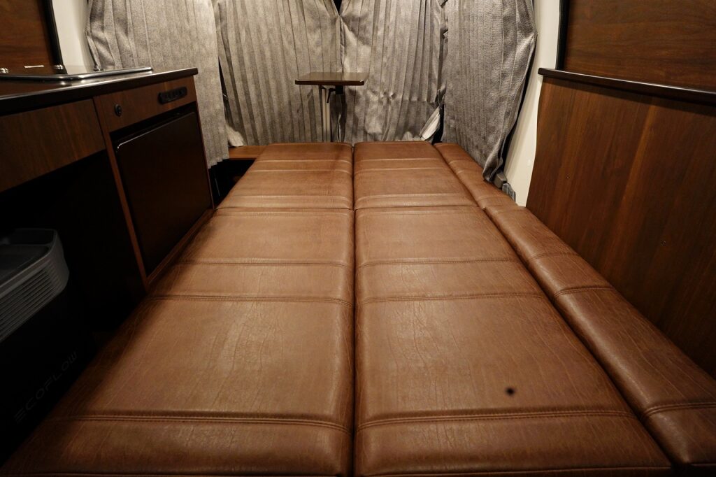 ベッド展開は、後方の横向きシートの背もたれを動かすだけの簡単操作。