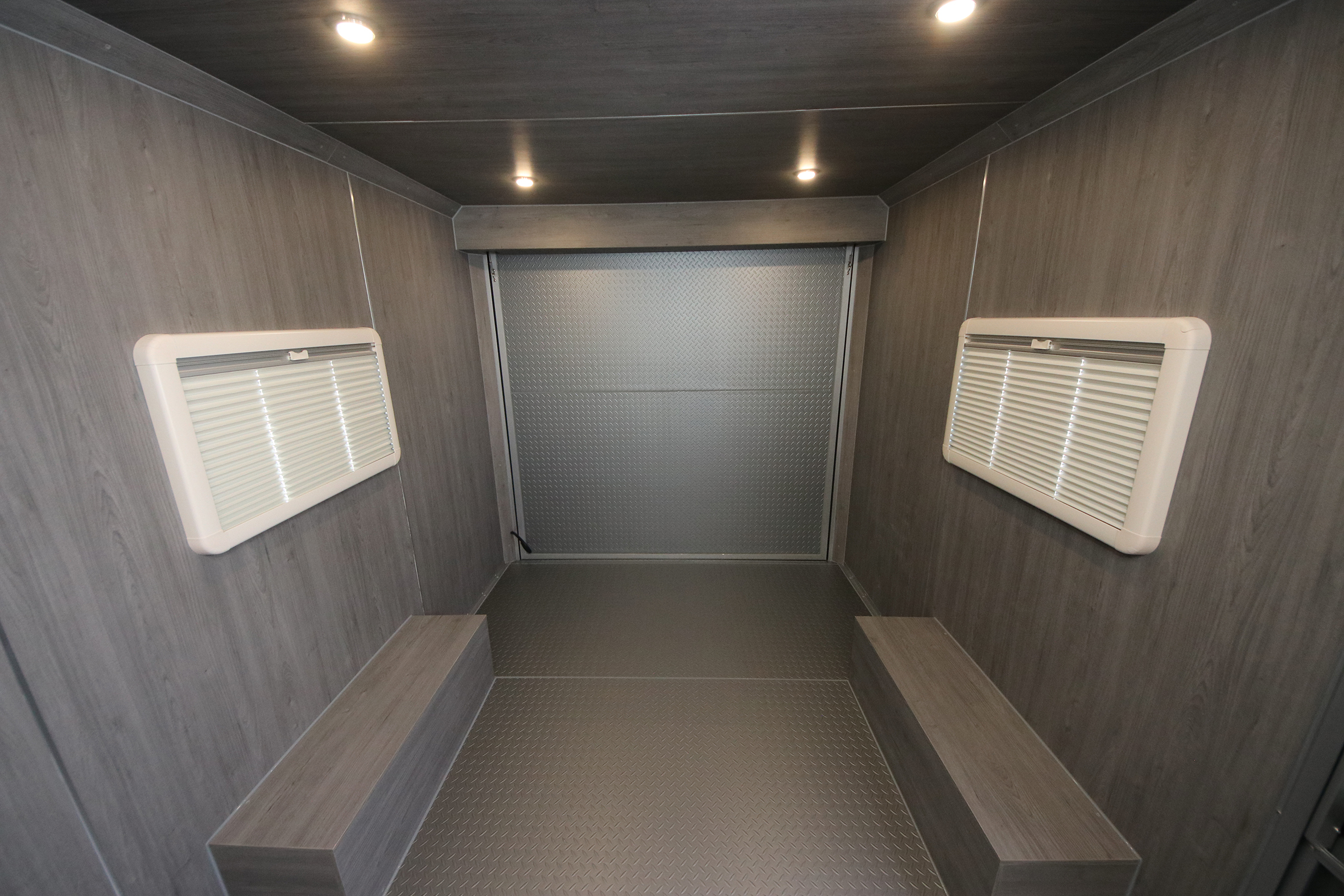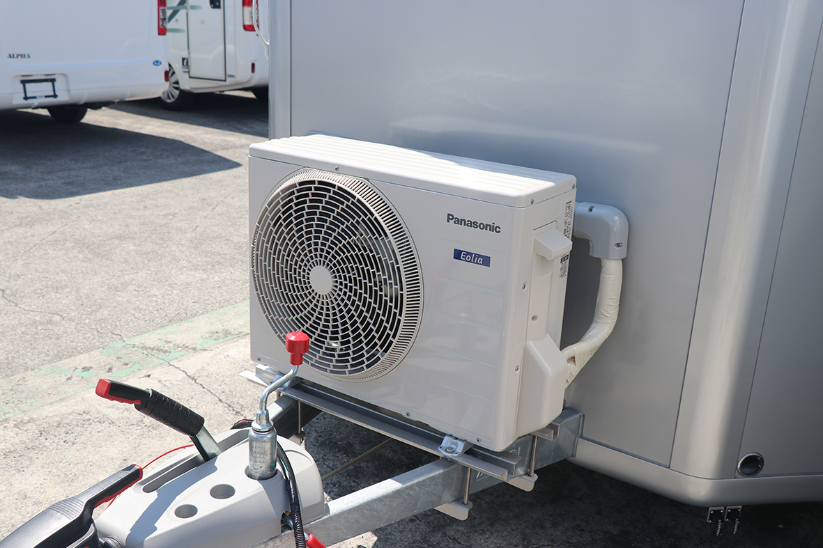 | 外装装備 | ・外装FRPパネル ・ボディ内部断熱材 ・大型リアハッチ ・アクリル二重窓 ・網戸付きエントランスドア ・コーナー安定ジャッキ ・安定ジャッキ用クランクハンドル ・慣性ブレーキ ・ダンバーアシスト付ハンドブレーキ |