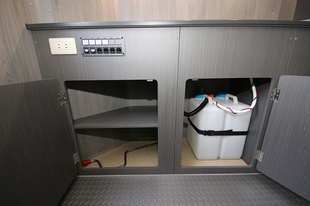 | 電気設備 | ・ディープサイクルサブバッテリー105Ah ・正弦波2000Wインバーター ・外部充電器(インバーター一体型) ・バッテリー管理モニター ・100V電源外部入力用プラグ ・100V電源外部入力用ケーブル ・100Vコンセント&12Vソケット&USBボード ・無線式バックアイカメラ&モニター ・ハイマウントストップランプ |
